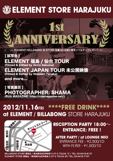 スケートボードシーンを牽引するブランド、ELEMENT。そのフラッグシップ的ストアーの原宿店の移転1周年を記念し、11月16日(金)~18日(日)の3日間 ELEMENT/BILABONG STORE 原宿店で特別SALEを開催される。これは通常のSALEではなく、楽しんで買い物ができるよういろいろとイベント的要素もあるとのことだ。さらにSALE初日の本日18時より1st ANNIVERSARY Partyを開催、パーティーではELEMENET/BILLABONG 各STORE 先着50名に、このパーティーでしか手に入らない限定ノベルティをプレゼント! そして、なんとこのノベルティには年間20%OFFの豪華特典もついてる!そしてさらにさらに、1st ANNIVERSARY Party後は会場を移しアフターパーティも開催されるぞ!!??